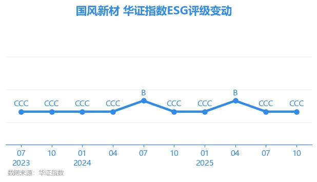 日前,华证指数公布了新一期(2025年10月31日)的ESG评级结果,国风新材(000859.SZ)获得CCC评级(华证指数评级为C起至AAA九档,C为最低档,AAA为其最高一级评级/AA为其第二档),上一期(2025年7月31日)ESG评级为CCC。本期ESG评级在494家化学制品行业A股上市公司中排名第268(上一期排名第255)。