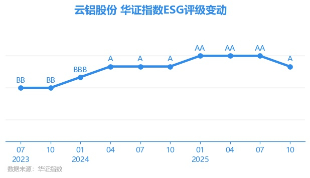 日前,华证指数公布了新一期(2025年10月31日)的ESG评级结果,云铝股份(000807.SZ)获得A评级(华证指数评级为C起至AAA九档,C为最低档,AAA为其最高一级评级/AA为其第二档),上一期(2025年7月31日)ESG评级为AA。本期ESG评级在206家金属与采矿行业A股上市公司中排名第30(上一期排名第19)。