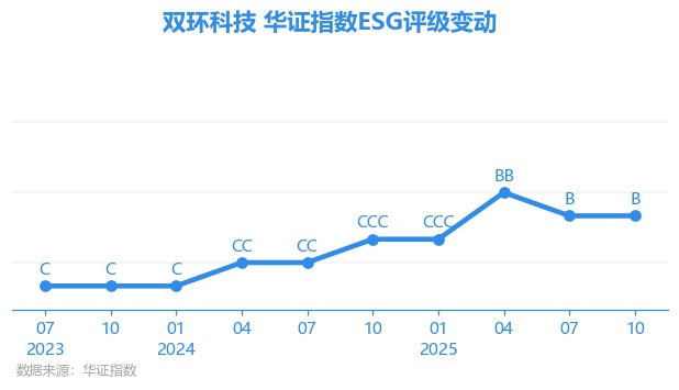 日前,华证指数公布了新一期(2025年10月31日)的ESG评级结果,双环科技(000707.SZ)获得B评级(华证指数评级为C起至AAA九档,C为最低档,AAA为其最高一级评级/AA为其第二档),上一期(2025年7月31日)ESG评级为B。本期ESG评级在494家化学制品行业A股上市公司中排名第177(上一期排名第166)。
