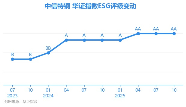 日前,华证指数公布了新一期(2025年10月31日)的ESG评级结果,中信特钢(000708.SZ)获得AA评级(华证指数评级为C起至AAA九档,C为最低档,AAA为其最高一级评级/AA为其第二档),上一期(2025年7月31日)ESG评级为AA。本期ESG评级在206家金属与采矿行业A股上市公司中排名第24(上一期排名第25)。