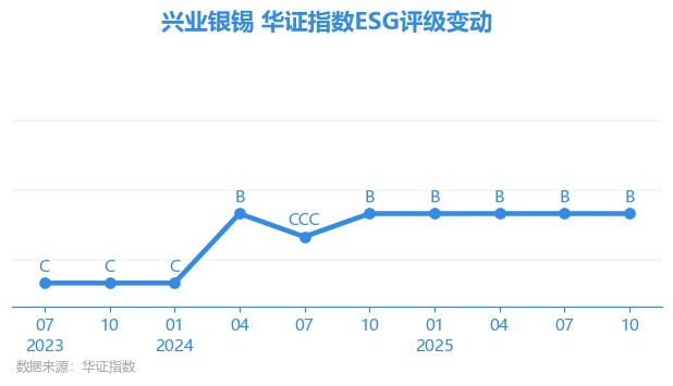 日前,华证指数公布了新一期(2025年10月31日)的ESG评级结果,兴业银锡(000426.SZ)获得B评级(华证指数评级为C起至AAA九档,C为最低档,AAA为其最高一级评级/AA为其第二档),上一期(2025年7月31日)ESG评级为B。本期ESG评级在206家金属与采矿行业A股上市公司中排名第117(上一期排名第121)。