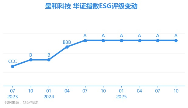 日前,华证指数公布了新一期(2025年10月31日)的ESG评级结果,呈和科技(688625.SH)获得A评级(华证指数评级为C起至AAA九档,C为最低档,AAA为其最高一级评级/AA为其第二档),上一期(2025年7月31日)ESG评级为A。本期ESG评级在494家化学制品行业A股上市公司中排名第60(上一期排名第64)。