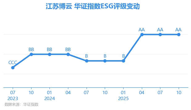 日前,华证指数公布了新一期(2025年10月31日)的ESG评级结果,江苏博云(301003.SZ)获得AA评级(华证指数评级为C起至AAA九档,C为最低档,AAA为其最高一级评级/AA为其第二档),上一期(2025年7月31日)ESG评级为AA。本期ESG评级在494家化学制品行业A股上市公司中排名第22(上一期排名第25)。