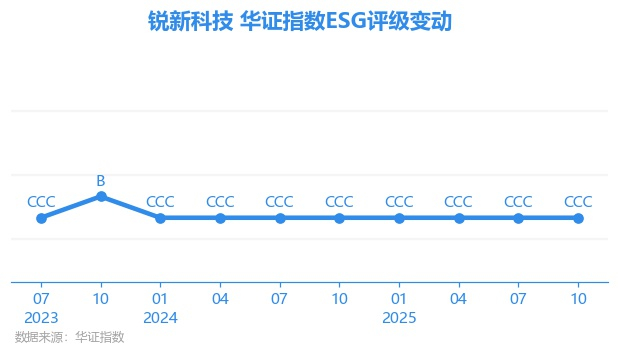日前,华证指数公布了新一期(2025年10月31日)的ESG评级结果,锐新科技(300828.SZ)获得CCC评级(华证指数评级为C起至AAA九档,C为最低档,AAA为其最高一级评级/AA为其第二档),上一期(2025年7月31日)ESG评级为CCC。本期ESG评级在206家金属与采矿行业A股上市公司中排名第164(上一期排名第143)。