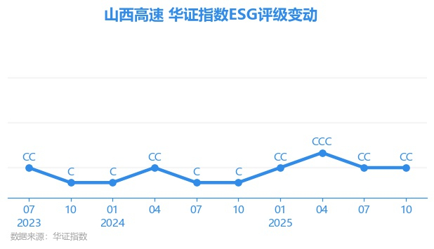 日前,华证指数公布了新一期(2025年10月31日)的ESG评级结果,山西高速(000755.SZ)获得CC评级(华证指数评级为C起至AAA九档,C为最低档,AAA为其最高一级评级/AA为其第二档),上一期(2025年7月31日)ESG评级为CC。本期ESG评级在45家交通基本设施行业A股上市公司中排名第34(上一期排名第35)。