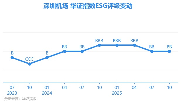 日前,华证指数公布了新一期(2025年10月31日)的ESG评级结果,深圳机场(000089.SZ)获得BB评级(华证指数评级为C起至AAA九档,C为最低档,AAA为其最高一级评级/AA为其第二档),上一期(2025年7月31日)ESG评级为BB。本期ESG评级在45家交通基本设施行业A股上市公司中排名第15(上一期排名第18)。