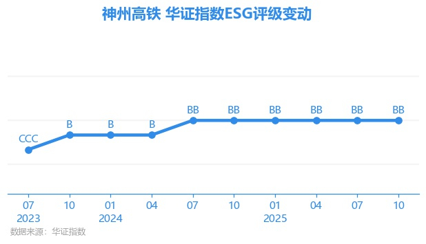 日前,华证指数公布了新一期(2025年10月31日)的ESG评级结果,神州高铁(000008.SZ)获得BB评级(华证指数评级为C起至AAA九档,C为最低档,AAA为其最高一级评级/AA为其第二档),上一期(2025年7月31日)ESG评级为BB。本期ESG评级在22家地面运输行业A股上市公司中排名第4(上一期排名第3)。