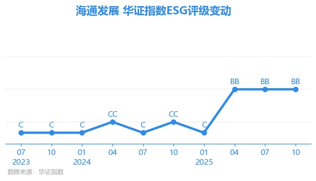 日前,华证指数公布了新一期(2025年10月31日)的ESG评级结果,海通发展(603162.SH)获得BB评级(华证指数评级为C起至AAA九档,C为最低档,AAA为其最高一级评级/AA为其第二档),上一期(2025年7月31日)ESG评级为BB。本期ESG评级在16家海上运输行业A股上市公司中排名第9(上一期排名第9)。