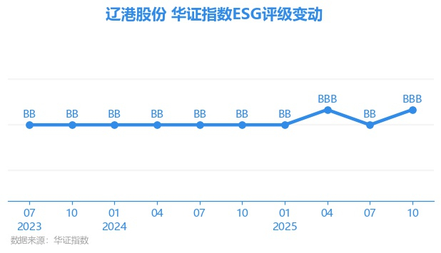 日前,华证指数公布了新一期(2025年10月31日)的ESG评级结果,辽港股份(601880.SH)获得BBB评级(华证指数评级为C起至AAA九档,C为最低档,AAA为其最高一级评级/AA为其第二档),上一期(2025年7月31日)ESG评级为BB。本期ESG评级在45家交通基本设施行业A股上市公司中排名第12(上一期排名第17)。