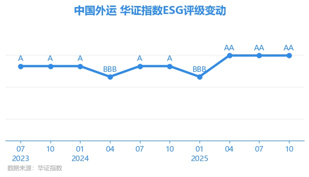 日前,华证指数公布了新一期(2025年10月31日)的ESG评级结果,中国外运(601598.SH)获得AA评级(华证指数评级为C起至AAA九档,C为最低档,AAA为其最高一级评级/AA为其第二档),上一期(2025年7月31日)ESG评级为AA。本期ESG评级在34家航空货运与物流行业A股上市公司中排名第2(上一期排名第1)。