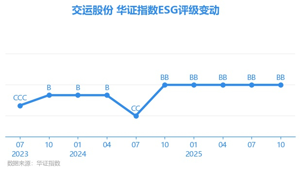 日前,华证指数公布了新一期(2025年10月31日)的ESG评级结果,交运股份(600676.SH)获得BB评级(华证指数评级为C起至AAA九档,C为最低档,AAA为其最高一级评级/AA为其第二档),上一期(2025年7月31日)ESG评级为BB。本期ESG评级在22家地面运输行业A股上市公司中排名第3(上一期排名第4)。