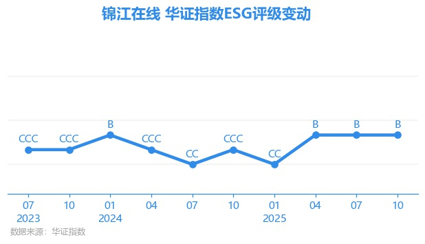 从细项得分来看,锦江在线E项得分78.01,评级为BB,行业内排名5/22(E项目评分维度包括气候变化、资源利用、环境友好、环境管理);S项得分70.41,评级为B,行业内排名22/22(S项目评分维度包括人力资本、产品责任、供应商、社会贡献);G项得分82.12,评级为BBB,行业内排名5/22(G项目评分维度包括股东权益、治理结构、信披质量、治理风险、外部处分、商业道德)。