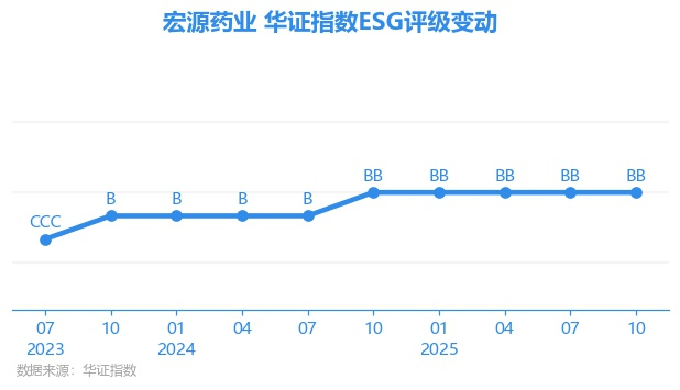 日前,华证指数公布了新一期(2025年10月31日)的ESG评级结果,宏源药业(301246.SZ)获得BB评级(华证指数评级为C起至AAA九档,C为最低档,AAA为其最高一级评级/AA为其第二档),上一期(2025年7月31日)ESG评级为BB。本期ESG评级在266家制药行业A股上市公司中排名第94(上一期排名第107)。
