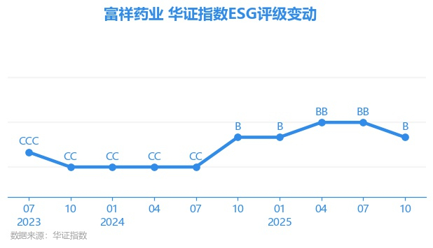 日前,华证指数公布了新一期(2025年10月31日)的ESG评级结果,富祥药业(300497.SZ)获得B评级(华证指数评级为C起至AAA九档,C为最低档,AAA为其最高一级评级/AA为其第二档),上一期(2025年7月31日)ESG评级为BB。本期ESG评级在266家制药行业A股上市公司中排名第140(上一期排名第113)。