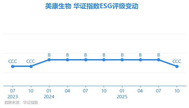 日前,华证指数公布了新一期(2025年10月31日)的ESG评级结果,美康生物(300439.SZ)获得CCC评级(华证指数评级为C起至AAA九档,C为最低档,AAA为其最高一级评级/AA为其第二档),上一期(2025年7月31日)ESG评级为B。本期ESG评级在33家生命科学工具和服务行业A股上市公司中排名第17(上一期排名第10)。