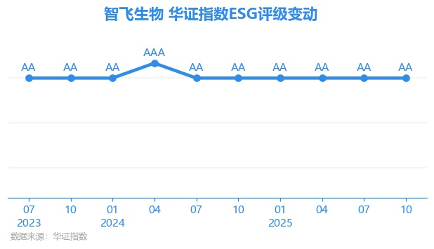 日前,华证指数公布了新一期(2025年10月31日)的ESG评级结果,智飞生物(300122.SZ)获得AA评级(华证指数评级为C起至AAA九档,C为最低档,AAA为其最高一级评级/AA为其第二档),上一期(2025年7月31日)ESG评级为AA。本期ESG评级在75家生物科技行业A股上市公司中排名第2(上一期排名第2)。