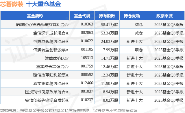 根据2025基金Q3季报公募基金重仓股数据,重仓该股的公募基金共44家,其中持有数量最多的公募基金为信达澳亚基金的信澳匠心臻选两年持有期混合。信澳匠心臻选两年持有期混合目前规模为17.38亿元,最新净值1.3023(12月5日),较上一交易日上涨1.01%,近一年上涨33.41%。该公募基金现任基金经理为朱然。朱然在任的基金产品包括:信澳转型创新股票A,管理时间为2021年12月20日至今,期间收益率为13.96%;信澳智选先锋一年持有期混合A,管理时间为2022年6月14日至今,期间收益率为12.11%;信澳汇智优选一年持有期混合A,管理时间为2022年11月22日至今,期间收益率为31.61%。