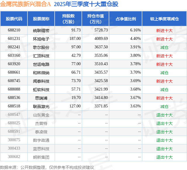 根据2025基金Q3季报公募基金重仓股数据,重仓该股的公募基金共5家,其中持有数量最多的公募基金为金鹰基金的金鹰民族新兴混合A。金鹰民族新兴混合A目前规模为6.32亿元,最新净值2.3867(12月5日),较上一交易日上涨1.02%,近一年上涨26.07%。该公募基金现任基金经理为陈颖。陈颖在任的基金产品包括:金鹰核心资源混合A,管理时间为2019年1月26日至今,期间收益率为233.9%;金鹰红利价值混合A,管理时间为2020年4月28日至今,期间收益率为163.03%;金鹰科技创新股票A,管理时间为2021年5月18日至今,期间收益率为110.67%;金鹰科技致远混合A,管理时间为2024年3月19日至今,期间收益率为74.83%。