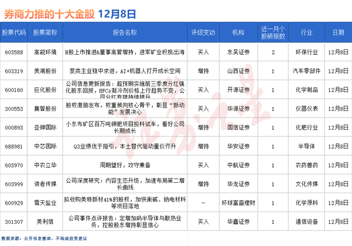 除了上述个股外,还有巨化股份、集智股份、亚钾国际、中芯国际、中农立华、读者传媒、雪天盐业、美利信等多股备受券商关注。