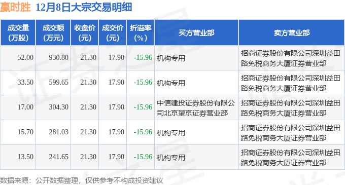 证券之星消息,12月8日赢时胜发生大宗交易,交易数据如下: