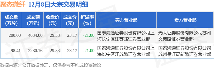 证券之星消息,12月8日聚杰微纤发生大宗交易,交易数据如下: