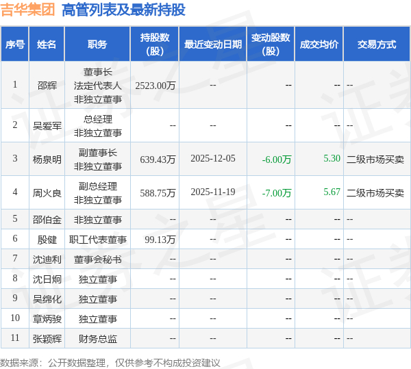 吉华集团近半年内的董监高及核心技术人员增减持详情如下: