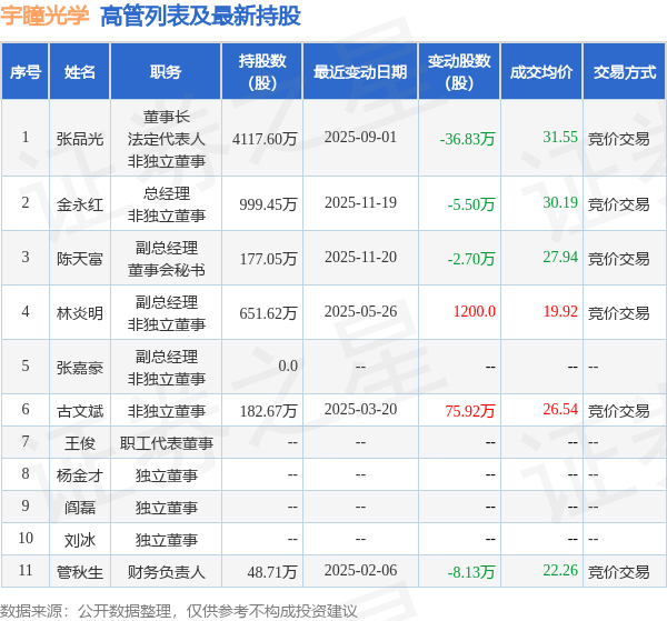 宇瞳光学近半年内的董监高及核心技术人员增减持详情如下: