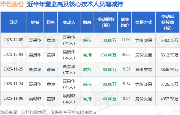 华伍股份近半年内的董监高及核心技术人员增减持详情如下: