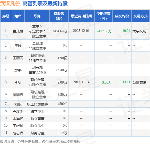 武汉凡谷近半年内的董监高及核心技术人员增减持详情如下: