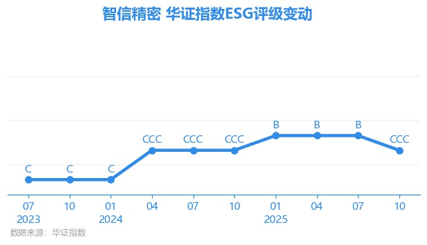 日前,华证指数公布了新一期(2025年10月31日)的ESG评级结果,智信精密(301512.SZ)获得CCC评级(华证指数评级为C起至AAA九档,C为最低档,AAA为其最高一级评级/AA为其第二档),上一期(2025年7月31日)ESG评级为B。本期ESG评级在492家机械制造行业A股上市公司中排名第300(上一期排名第222)。