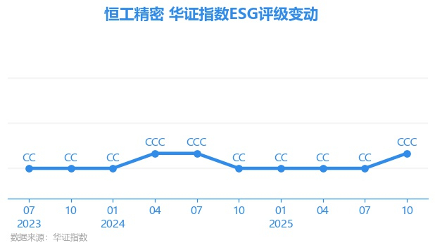 日前,华证指数公布了新一期(2025年10月31日)的ESG评级结果,恒工精密(301261.SZ)获得CCC评级(华证指数评级为C起至AAA九档,C为最低档,AAA为其最高一级评级/AA为其第二档),上一期(2025年7月31日)ESG评级为CC。本期ESG评级在492家机械制造行业A股上市公司中排名第349(上一期排名第413)。