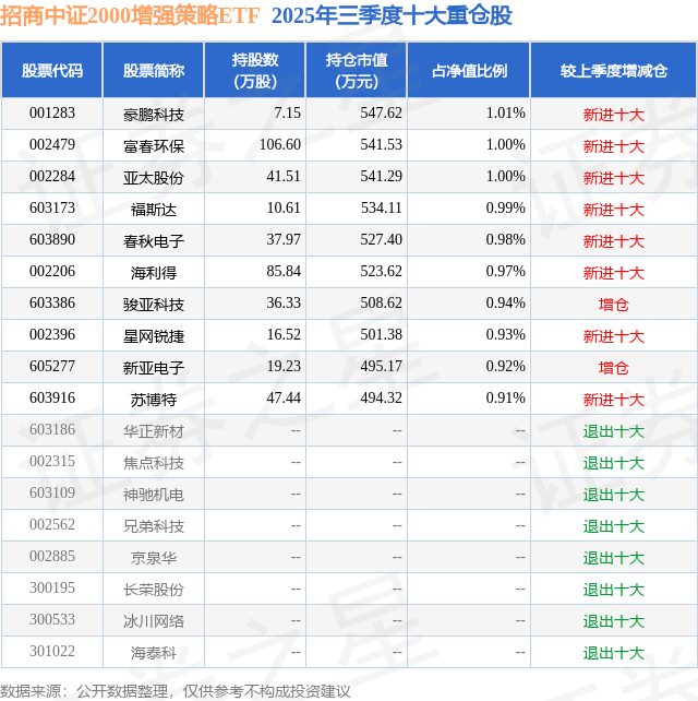 招商中证2000增强策略ETF的前十大重仓股如下: