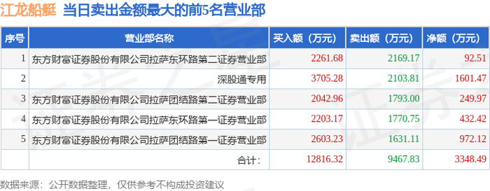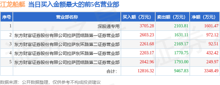 证券之星消息,沪深交易所2025年12月9日公布的交易公开信息显示,江龙船艇(300589)因日换手率达到30%的前5只证券登上龙虎榜。此次是近5个交易日内第3次上榜。