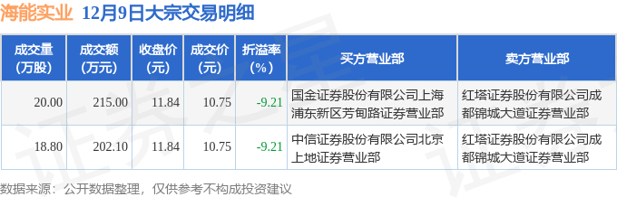 证券之星消息,12月9日海能实业发生大宗交易,交易数据如下: