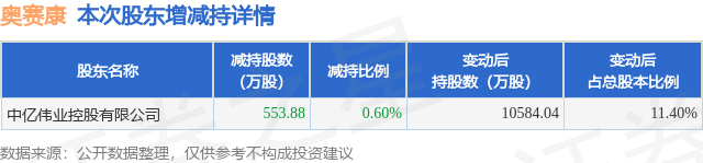 证券之星消息,12月9日奥赛康发布公告《奥赛康:持股5%以上股东减持计划期限届满暨实施结果的公告》,其股东中亿伟业控股有限公司于2025年11月15日至2025年12月5日间合计减持553.88万股,占公司目前总股本的0.5968%,变动期间该股股价下跌13.26%,截止12月5日收盘报17.08元。