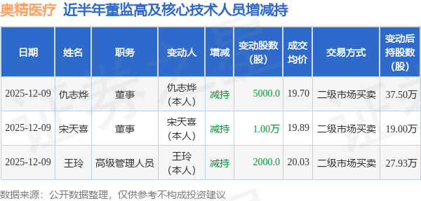 证券之星消息,根据12月9日市场公开信息、上市公司公告及交易所披露数据整理,奥精医疗(688613)最新董监高及相关人员股份变动情况:2025年12月9日公司董事仇志烨、董事宋天喜、高级管理人员王玲共减持公司股份1.7万股,占公司总股本为0.0124%。变动期间公司股价上涨3.21%,12月9日当日收盘报20.27元。