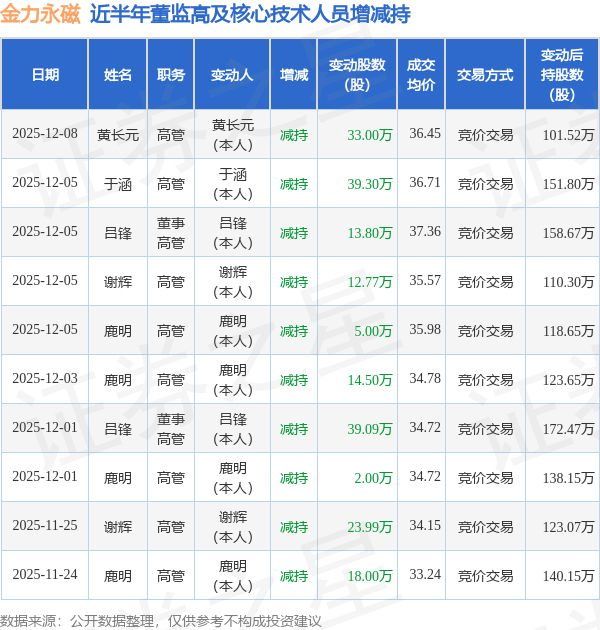 证券之星消息,根据12月9日市场公开信息、上市公司公告及交易所披露数据整理,金力永磁(300748)最新董监高及相关人员股份变动情况:2025年12月8日公司高管黄长元共减持公司股份33.0万股,占公司总股本为0.024%。变动期间公司股价下跌0.11%,12月8日当日收盘报36.4元。