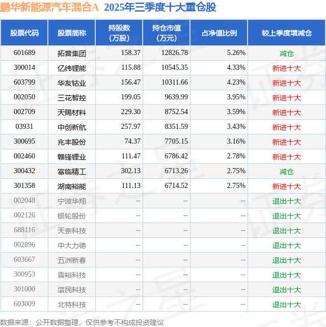 鹏华新能源汽车混合A的前十大重仓股如下: