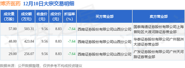 证券之星消息,12月10日博济医药发生大宗交易,交易数据如下:
