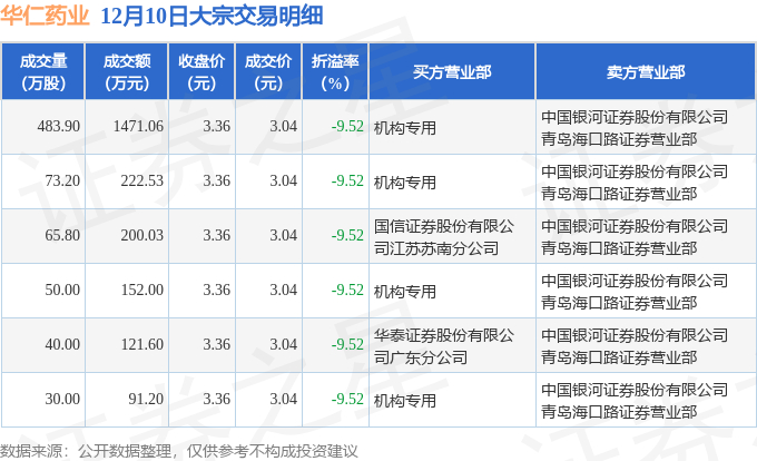 证券之星消息,12月10日华仁药业发生大宗交易,交易数据如下: