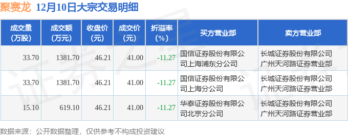 证券之星消息,12月10日聚赛龙发生大宗交易,交易数据如下: