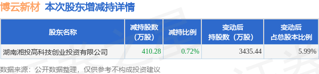 证券之星消息,12月10日博云新材发布公告《博云新材:关于持股5%以上股东减持股份触及1%整数倍的公告》,其股东湖南湘投高科技创业投资有限公司于2025年12月4日至2025年12月9日间合计减持410.28万股,占公司目前总股本的0.7159%,变动期间该股股价上涨5.12%,截止12月9日收盘报10.26元。
