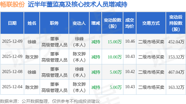 证券之星消息,根据12月10日市场公开信息、上市公司公告及交易所披露数据整理,畅联股份(603648)最新董监高及相关人员股份变动情况:2025年12月8日至2025年12月9日公司董事,高级管理人员徐峰、董事,高级管理人员陈文晔共减持公司股份30.0万股,占公司总股本为0.0828%。变动期间公司股价上涨0.19%,12月9日当日收盘报10.42元。
