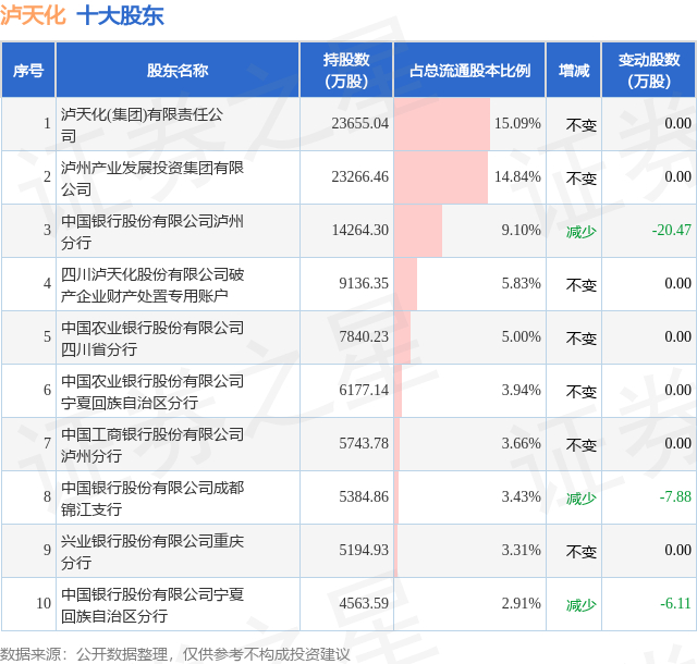 证券之星消息,12月10日泸天化发布公告《泸天化:持股5%以上股东的一致行动人减持股份计划实施期限届满暨减持股份计划实施完毕的公告》,其股东中国农业银行股份有限公司宁夏回族自治区分行于2025年11月7日至2025年11月10日间合计减持791.21万股,占公司目前总股本的0.5046%,变动期间该股股价上涨9.48%,截止11月10日收盘报4.85元。