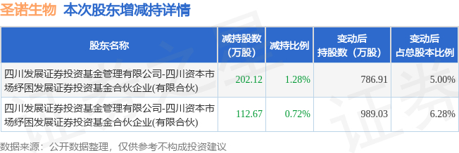 证券之星消息,12月10日圣诺生物发布公告《圣诺生物:简式权益变动报告书(川发投资)》,其股东四川发展证券投资基金管理有限公司-四川资本市场纾困发展证券投资基金合伙企业(有限合伙)于2025年9月18日至2025年12月10日间合计减持314.79万股,占公司目前总股本的2.0001%,变动期间该股股价上涨4.99%,截止12月10日收盘报41.44元。