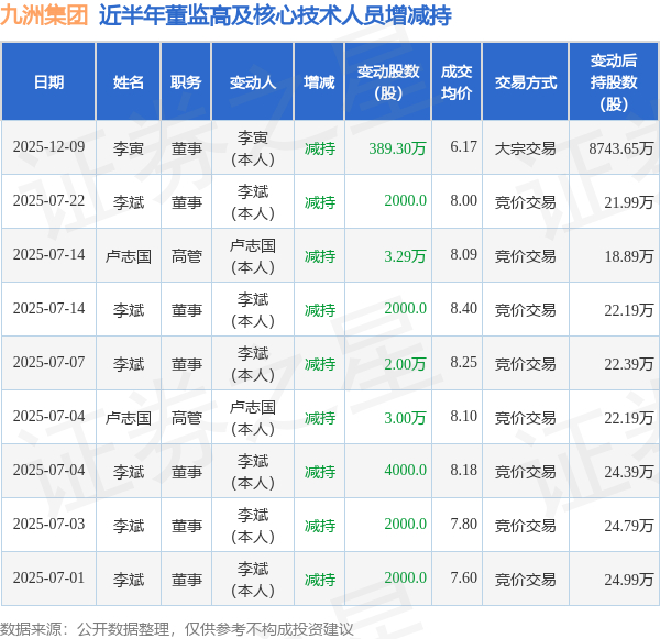 九洲集团近半年内的董监高及核心技术人员增减持详情如下: