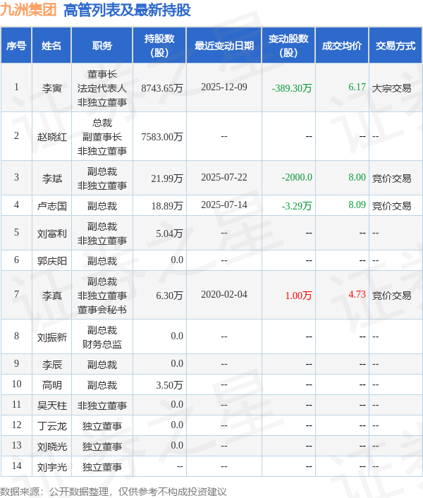 九洲集团的高管列表及最新持股情况如下: