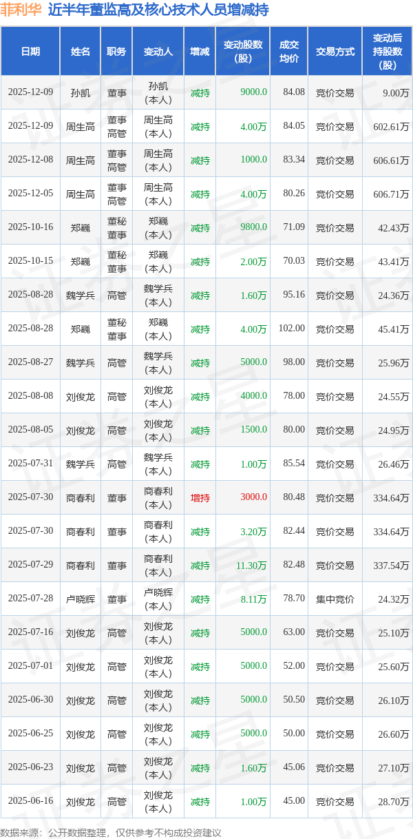菲利华近半年内的董监高及核心技术人员增减持详情如下: