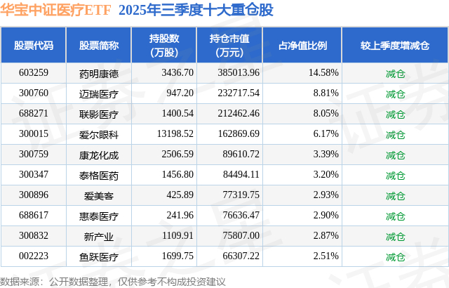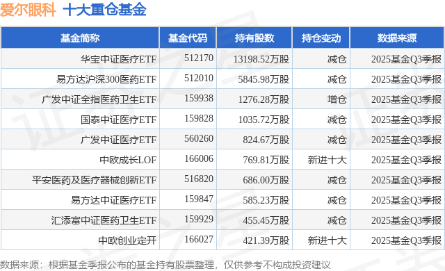 根据2025基金Q3季报公募基金重仓股数据,重仓该股的公募基金共45家,其中持有数量最多的公募基金为华宝基金的华宝中证医疗ETF。华宝中证医疗ETF目前规模为264.04亿元,最新净值0.3428(12月10日),较上一交易日上涨0.18%,近一年下跌3.05%。该公募基金现任基金经理为胡洁。胡洁在任的基金产品包括:华宝中证银行ETF联接A,管理时间为2012年10月16日至今,期间收益率为180.56%;华宝医疗ETF联接A,管理时间为2015年5月21日至今,期间收益率为-62.01%;华宝中证军工ETF,管理时间为2016年8月5日至今,期间收益率为40.56%;华宝中证银行ETF,管理时间为2017年7月18日至今,期间收益率为64.42%。