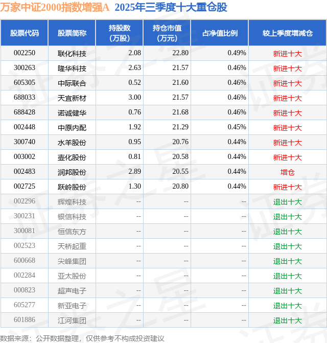 根据2025基金Q3季报公募基金重仓股数据,重仓该股的公募基金共1家,其中持有数量最多的公募基金为万家基金的万家中证2000指数增强A。万家中证2000指数增强A目前规模为0.13亿元,最新净值1.3537(12月10日),较上一交易日上涨0.01%。该公募基金现任基金经理为乔亮 张永强。乔亮在任的基金产品包括:万家量化睿选混合A,管理时间为2019年8月21日至今,期间收益率为61.7%;万家中证1000指数增强A,管理时间为2019年8月21日至今,期间收益率为124.22%;万家沪深300指数增强A,管理时间为2019年9月6日至今,期间收益率为48.23%;万家中证500指数增强A,管理时间为2019年9月6日至今,期间收益率为105.17%。张永强在任的基金产品包括:万家瑞丰灵活配置混合A,管理时间为2023年1月3日至今,期间收益率为28.46%;万家创业板指数增强A,管理时间为2023年4月11日至今,期间收益率为41.36%;万家招瑞回报一年持有混合A,管理时间为2023年8月1日至今,期间收益率为12.13%;万家惠利债券A,管理时间为2023年8月1日至今,期间收益率为6.44%。